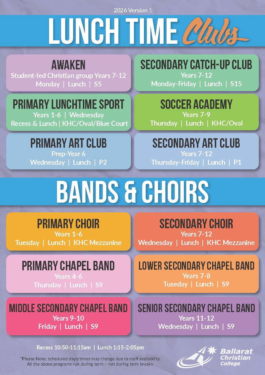 In addition to teaching their subject areas, Ballarat Christian College teachers are expected to be able to fulfil homeroom and pastoral care roles in accordance with the College’s biblical stance, including teaching the College’s Christian Studies course, leading devotions, and prayer.